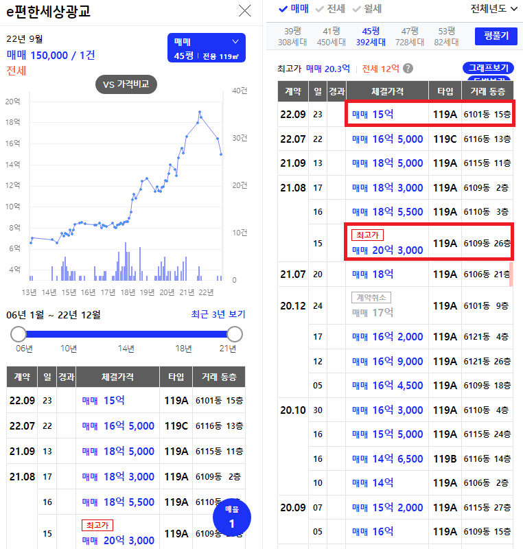 그리고 다시 하락장을 맞으면서 올해 2022년 9월인 최근 실거래는 15억원으로 5억 3천만 원이 하락하였고