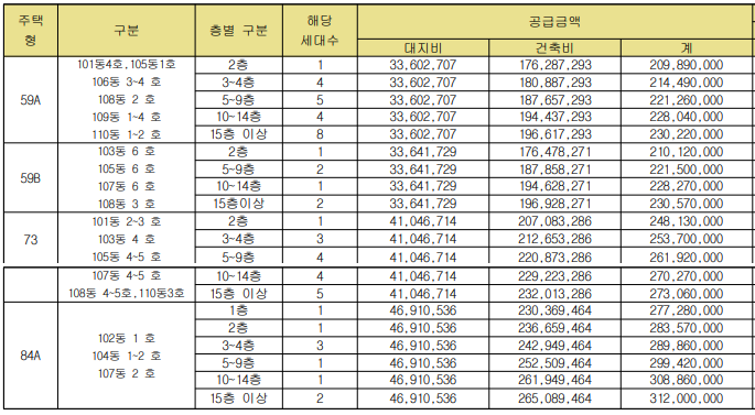 위 그림을 보시면 24평의 분양가는 209,890,000원 ~ 230,570,000원 까지 나와있는 걸 확인하실 수 있을 겁니다.