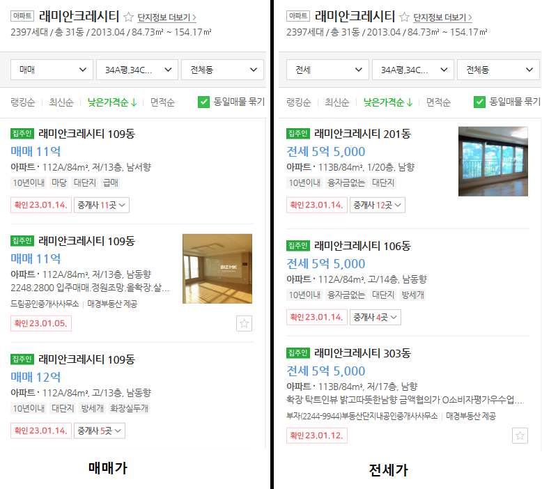위 그림에 나와있는 네이버부동산 매물만 봐도 전용 34평을 기준으로 저층이기는 하지만 현재 11억 원에