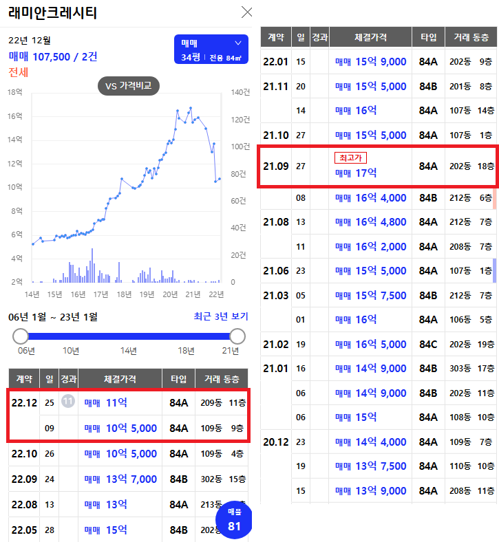 위 그림을 보시면 전용 34평을 기준으로 부동산 상승장인 2021년 9월에 매매 최고가 17억 원으로