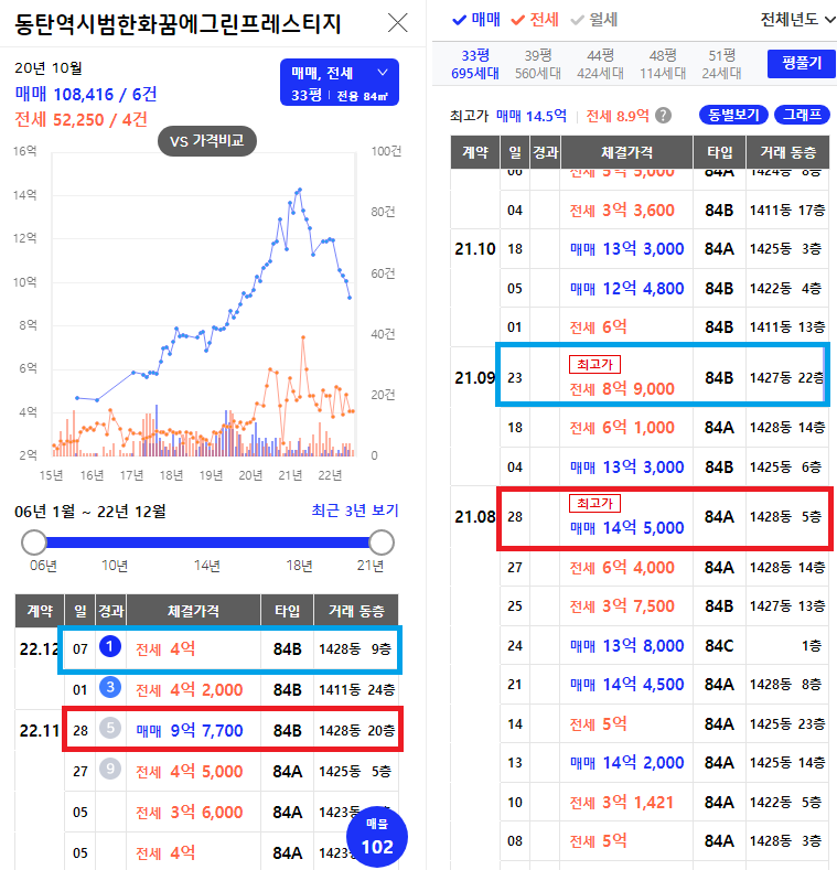 그리고 이곳도 다른 신도시와 마찬가지로 아파트 가격이 최고점인 2021년에 전세계약을 하신 분들은 역전세