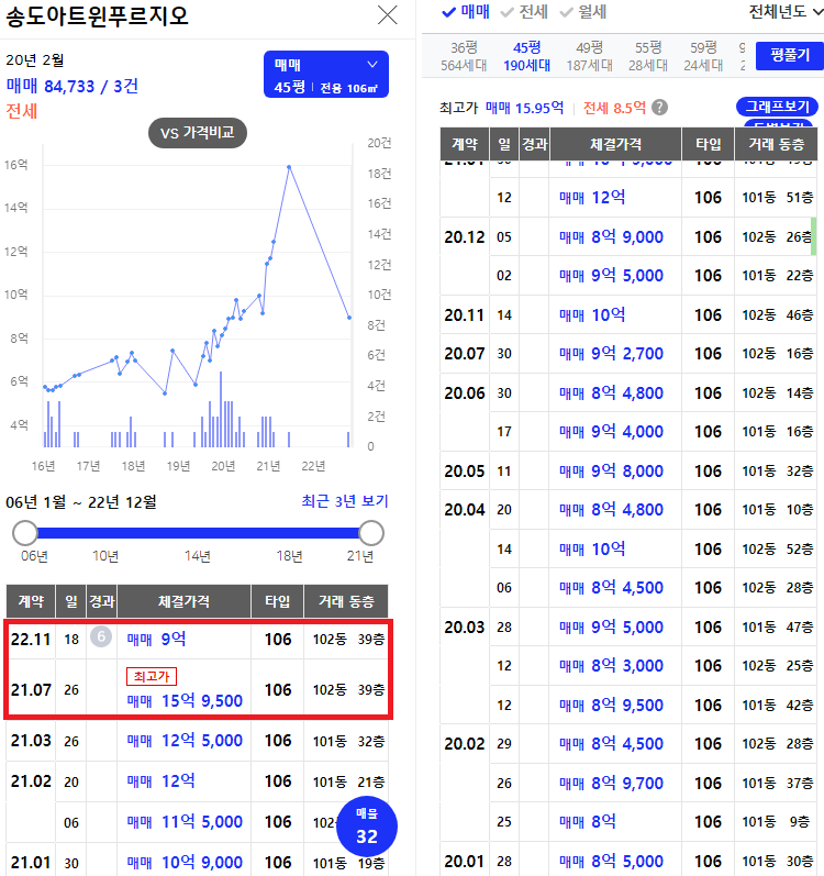 45평이 최고가 15억 9천5백만 원에 매매 체결이 되고 대략 1년 4개월 지난 올해 11월 18일에 같은 동 같은 층으로