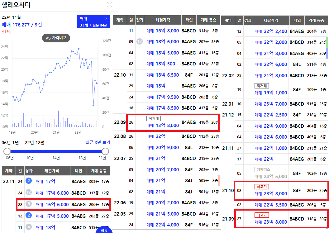 위 그림을 보시면 아시겠지만 전용 84㎡ , 33평을 기준으로 2021년 9월과 10월에 각각 최고가 23억 8천만 원으로