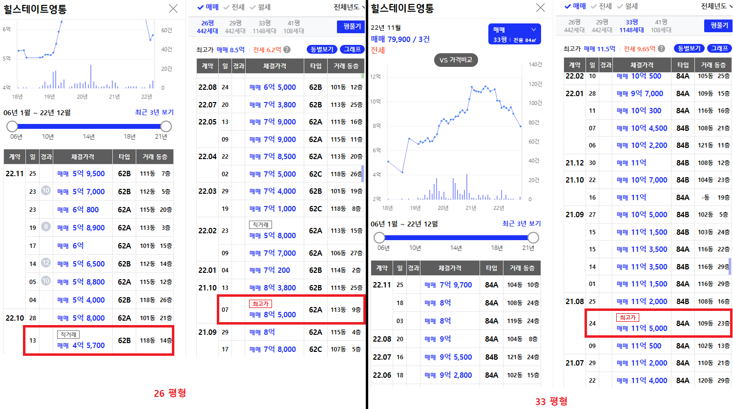 2021년 10월에 최고가 8억 5천만 원에 거래가 체결되었고 33평의 경우 2021년 8월에 최고가 11억 5천만 원에
