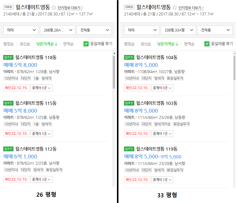 네이버 부동산에서 아파트 매물을 봐도 현재 26평은 5억 8천만 원에 매물이 나와있고, 33평의 경우 8억 5천만 원에